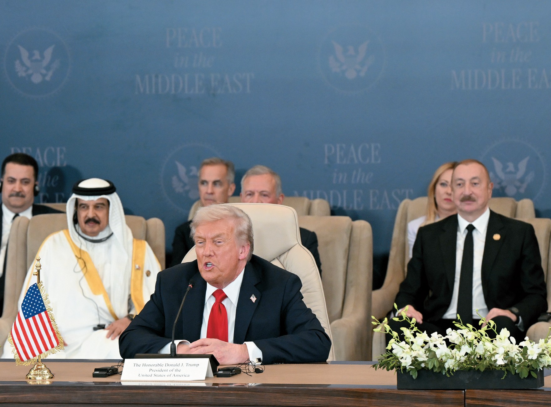 Amerika lideri Azərbaycan Prezidentinin regionda dayanıqlı sülhün yaradılmasındakı xüsusi xidmətlərini bu toplantıda da vurğulayıb. Sammitdə azərbaycanlı həmkarını salamlayan Ağ Ev sahibi Azərbaycan Prezidentini «sülhsevər» adlandırıb, eyni zamanda bildirib ki, «onunla düşmən olmaq istəməzdiniz». Ermənistan-Azərbaycan münaqişəsinin həllindən danışan D.Tramp avqustun 8-də Vaşinqtonda Azərbaycan və Ermənistan liderləri ilə keçirdiyi görüşü xatırladaraq deyib: «Onlar Oval kabinetdəki görüşdə qarşı-qarşıya əyləşmişdilər. Bu iki ölkə arasında müharibə düz 31 il davam etmişdi. Biz işimizi bitirdikdən sonra isə onlar qucaqlaşdılar. İndi onlar dostdurlar və çox yaxşı yola gedirlər. Buna görə hər ikinizə (Azərbaycan Prezidentinə və Ermənistanın Baş nazirinə) təşəkkür edirəm. Bu, inanılmazdır».