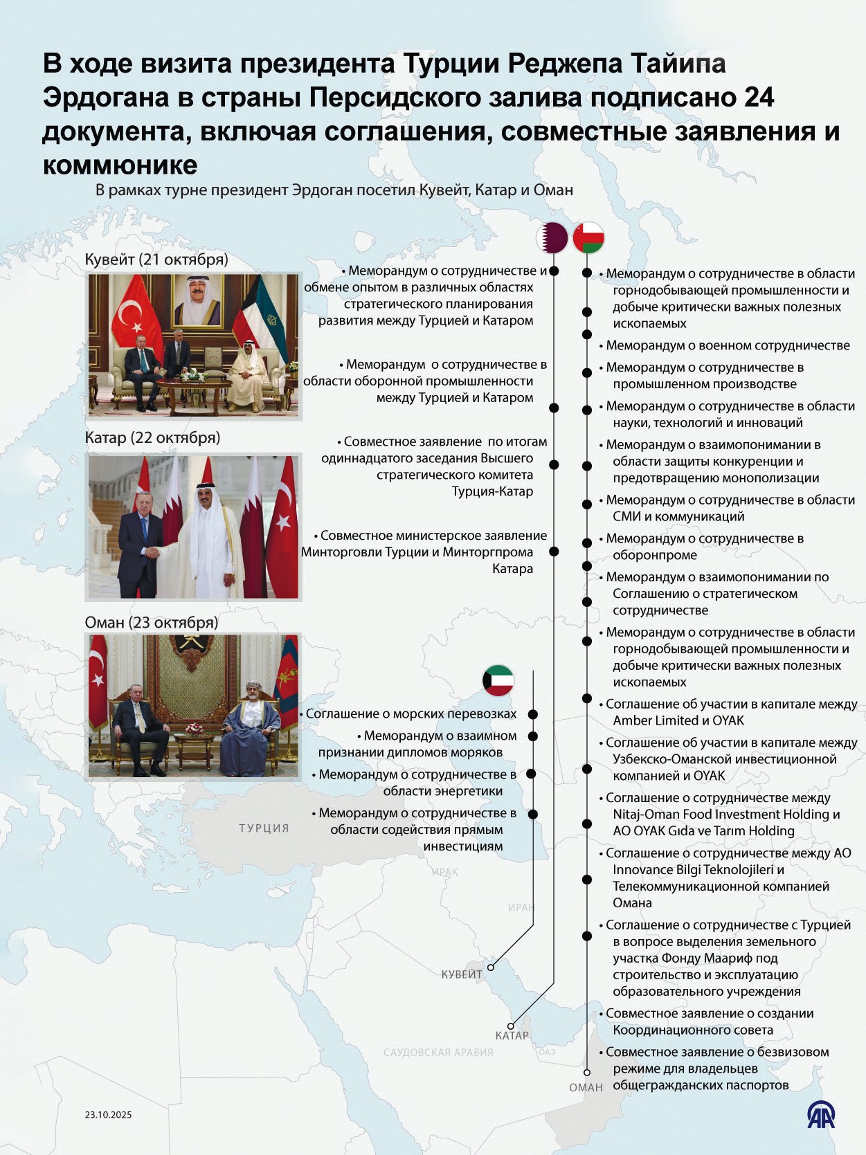 Misirin Şarm əl-Şeyx şəhərində Qəzza münaqişəsinin nizamlanmasına dair sülh sazişinin imzalanmasından sonra Türkiyə, Qətər və Misir formalaşmaqda olan yeni regional düzəndə aparıcı mövqelərə yüksəliblər. Türkiyə Prezidenti Rəcəb Tayyib Ərdoğanın belə bir dövrdə Fars körfəzi ölkələrinə səfəri xüsusi əhəmiyyət daşıyırdı. Bu səfər Ankaranın regiondakı proseslərə təsirini gücləndirmək, körfəz ölkələri ilə əməkdaşlığın yeni prioritetlərini müəyyənləşdirmək, Türkiyənin islam dünyasında əsas güc mərkəzlərindən bini rolunu təsdiqləmək istəyinin göstəricisi kimi qiymətləndirilir.