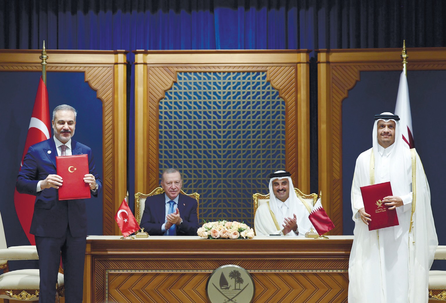 Əmir Tamim bin Hamad əl-Tani «Əmiri Divan» sarayında qonağı şəxsən qarşılayıb. Bu, iki ölkə arasındakı sabit siyasi münasibətin göstəricisidir. Bu münasibət müdafiə və humanitar sahələrdəki əlaqələrlə daha da möhkəmlənib. Səfərin əsas hadisəsi Türkiyə ilə Qətər arasında Ali Strateji Komitənin 11-ci iclasının keçirilməsi olub. Görüşdə sənaye, ticarət, enerji, strateji planlaşdırma və müdafiə sahələrində əməkdaşlığın genişləndirilməsinə yönəlmiş yeni sazişlər imzalanıb. Tərəflər hərbi-texnoloji tərəfdaşlığa dair razılaşmaya xüsusi diqqət ayırıb. Bu razılaşma silah istehsalı və texnologiya mübadiləsini nəzərdə tutur. Qətər mənbələrinin məlumatına görə, keçirilmiş görüşlərdə Qətər Hərbi Hava Qüvvələrinin arsenalında olan «Eurofighter Typhoon» qırıcılarının Türkiyəyə verilməsi imkanları da müzakirə edilib. Bu, təbii ki, iki ölkənin hərbi strukturları arasında yüksək etimadın göstəricisdir.