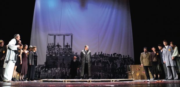 Искусство убить нельзя. Даже если его поместить в такую резервацию, как гетто. Оно будет жить, пока жива душа народа. Его музыка, его песни, его культура. Концептуальный театр Автандила Варсимашвили - это позиция художника по отношению к обществу и его проблемам. Такой театр будит мысль, заставляет думать и сопереживать. А еще - делать выводы и принимать решения. Мариан Швелидзе - художник-постановщик спектакля - в глубине сцены дает рисованный задник, на котором изображены люди, представляющие грузинское общество начала прошлого века. Они расположены на трибунах в соответствии со своим социальным статусом: есть и VIP-места, и места для тех, кто рангом пониже. Трибуны же, как на ипподроме. Люди из прошлого века, удобно расположившись на трибунах, с интересом наблюдают за происходящим. Что строили они и что собирались оставить в наследство своим потомкам? И как распорядились этим наследием те, кто строит жизнь сегодняшнего общества…