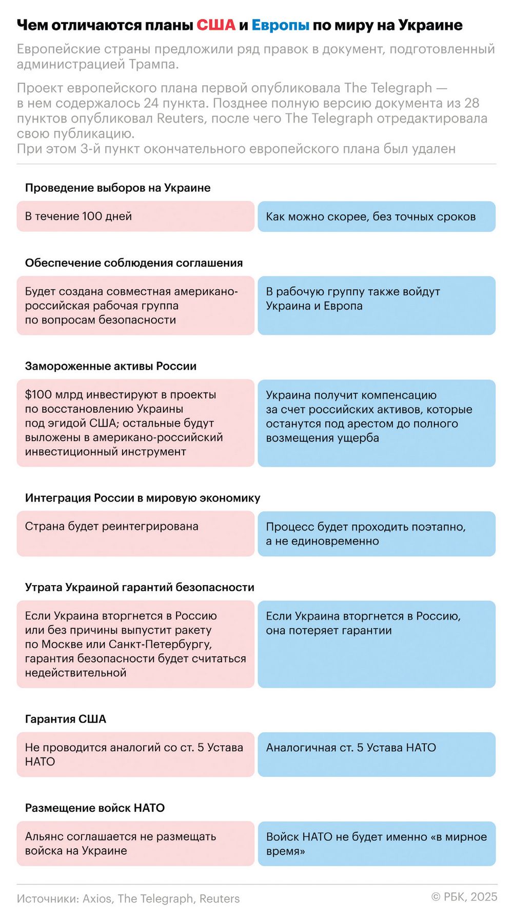 В результате сложных согласований сторонам удалось все-таки выработать вариант, состоящий из 22 пунктов, который учитывает как европейское, так и украинское видение перспектив урегулирования. При этом, как предполагается, ряд пунктов оставлен для обсуждения на встрече Трампа и Зеленского, дата которой пока не определена.